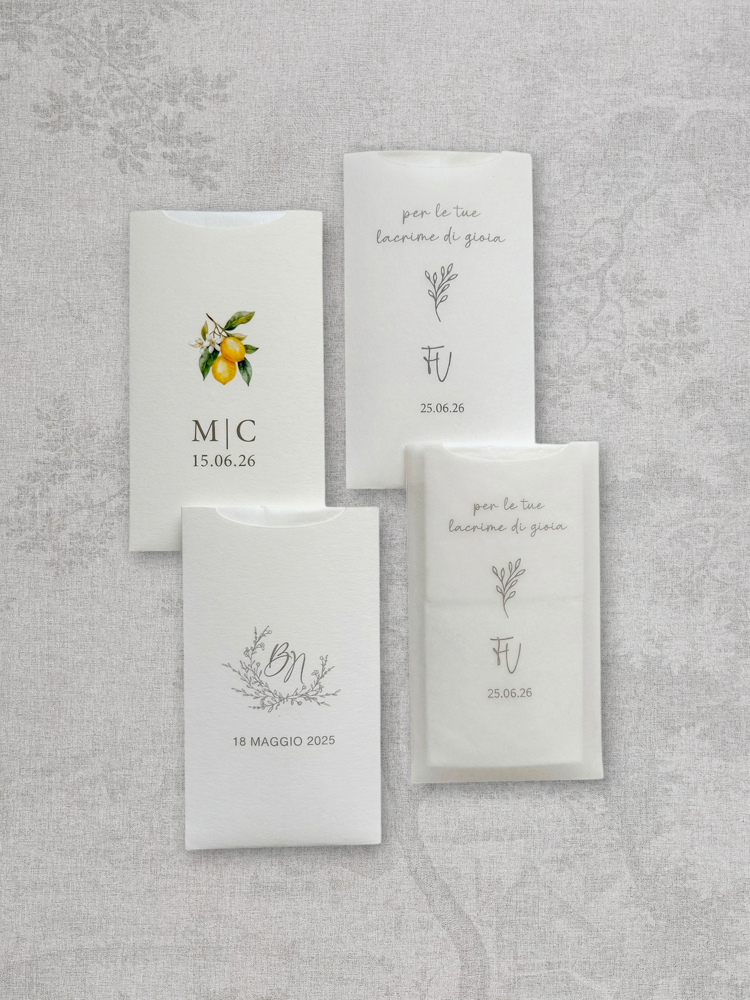 Fazzolettino in carta velina, racchiuso in una bustina trasparente con copertina personalizzata. Il design, essenziale e raffinato, può essere adattato con nomi, iniziali e data, in coordinato con tutta la vostra stationery.