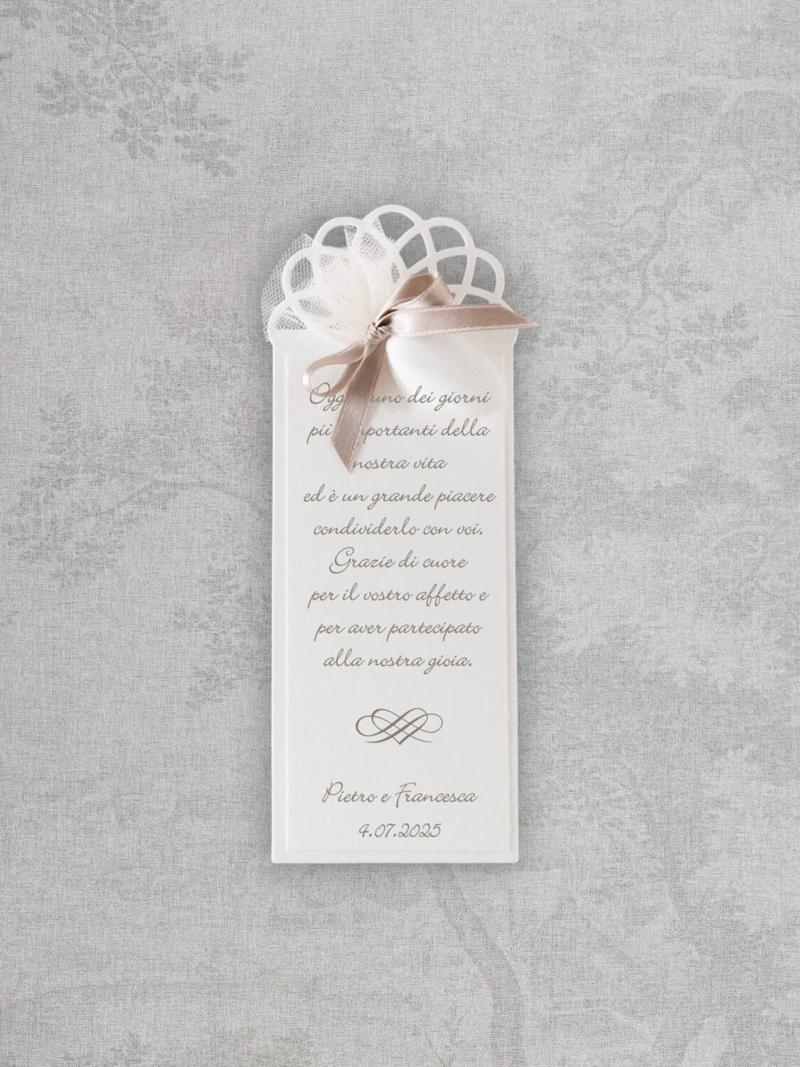 I biglietti per bomboniere e ringraziamento completano il tuo evento con un tocco di gentilezza e armonia. Coordinati alle partecipazioni e completamente personalizzabili, raccontano attenzione, stile e gratitudine.