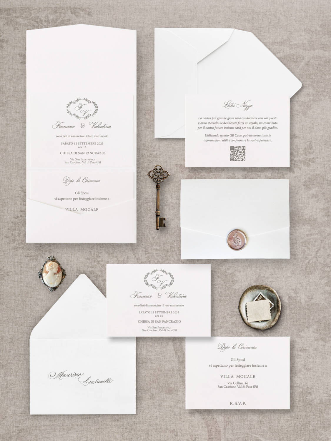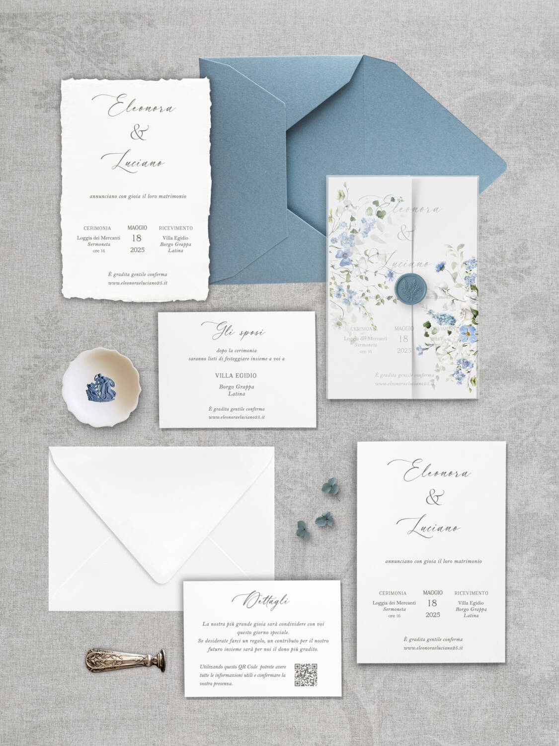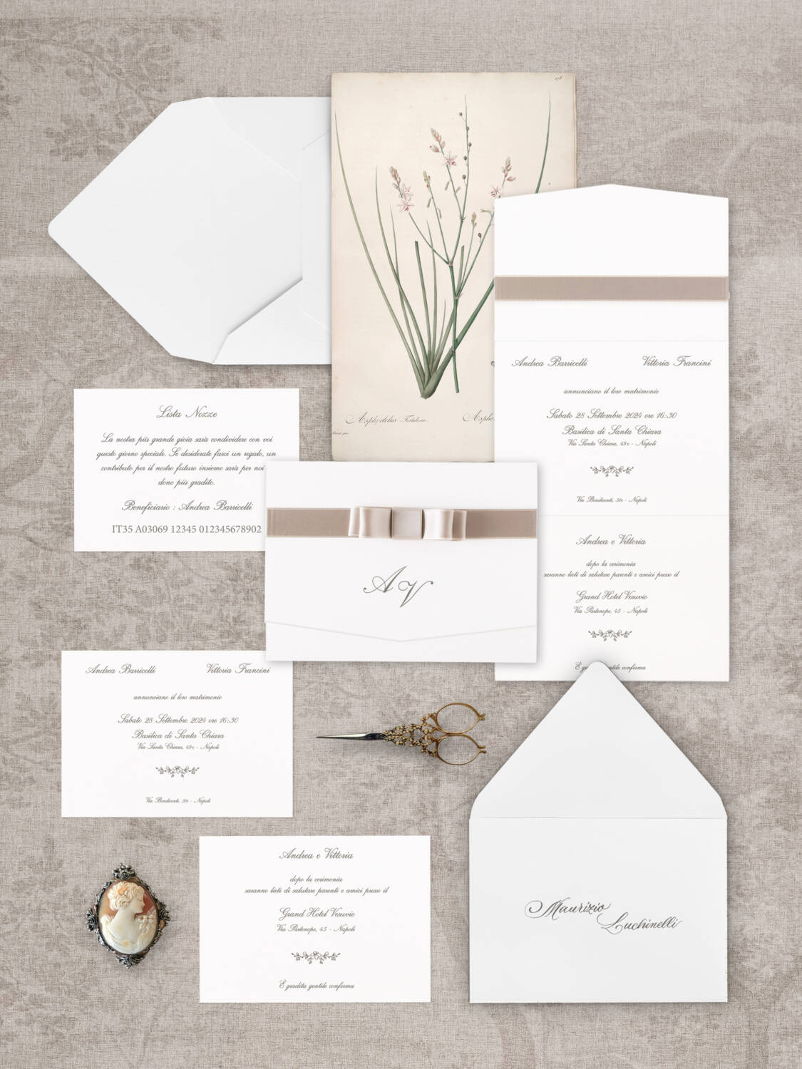 Che tu preferisca una combinazione “ton sur ton” o un deciso contrasto tra fiocco e carta, impreziosita dalla grafica e dagli altri motivi decorativi, la tua partecipazione elegante saprà comunicare ai tuoi invitati un gusto e uno stile assolutamente unici.