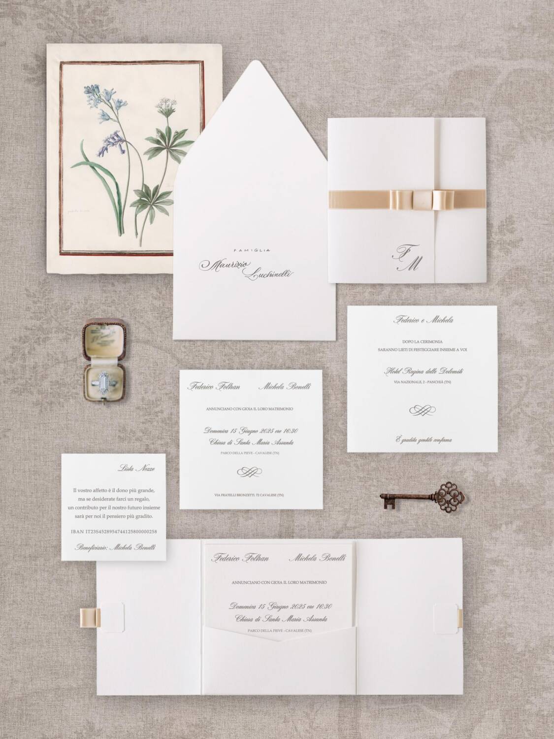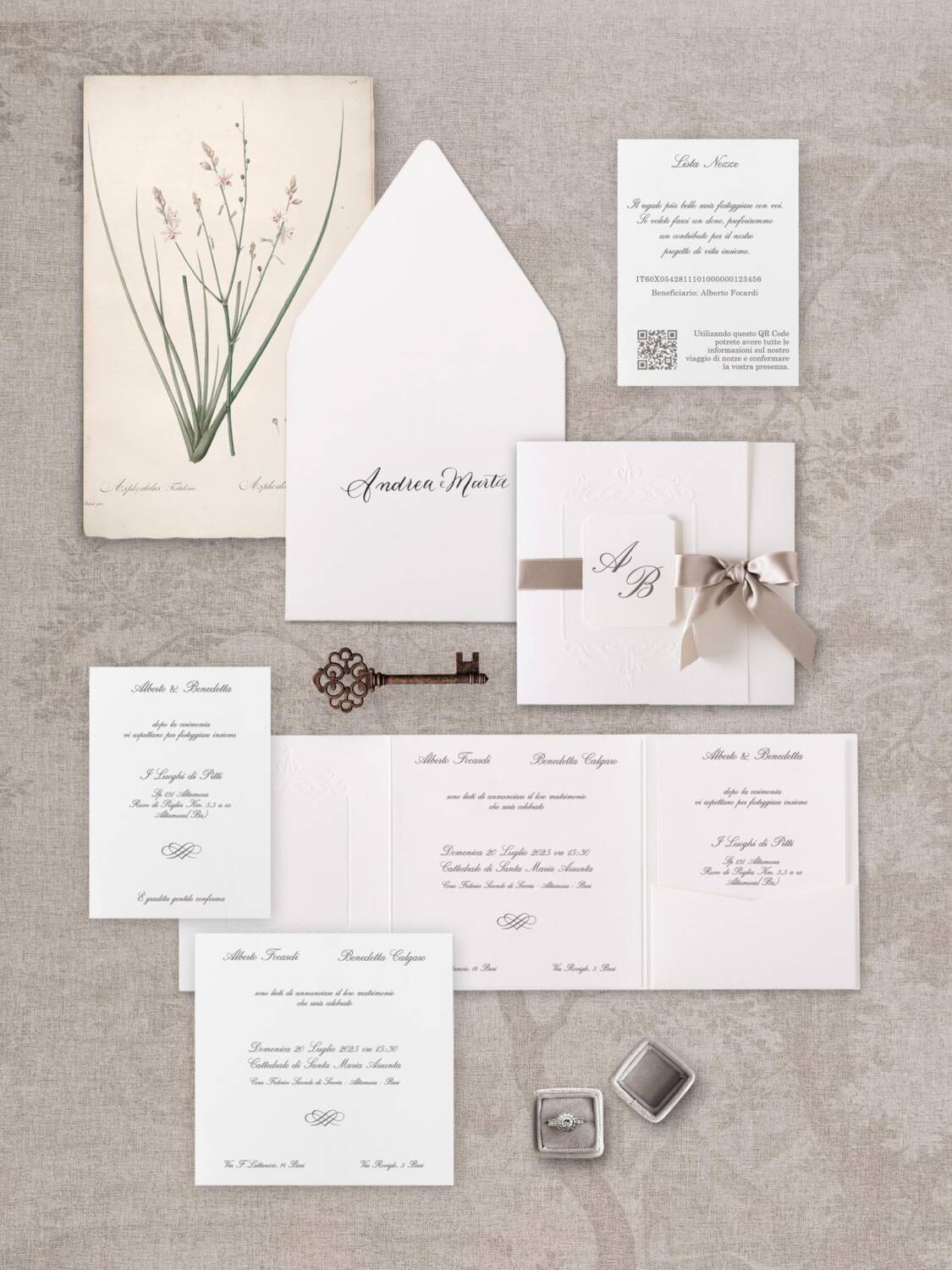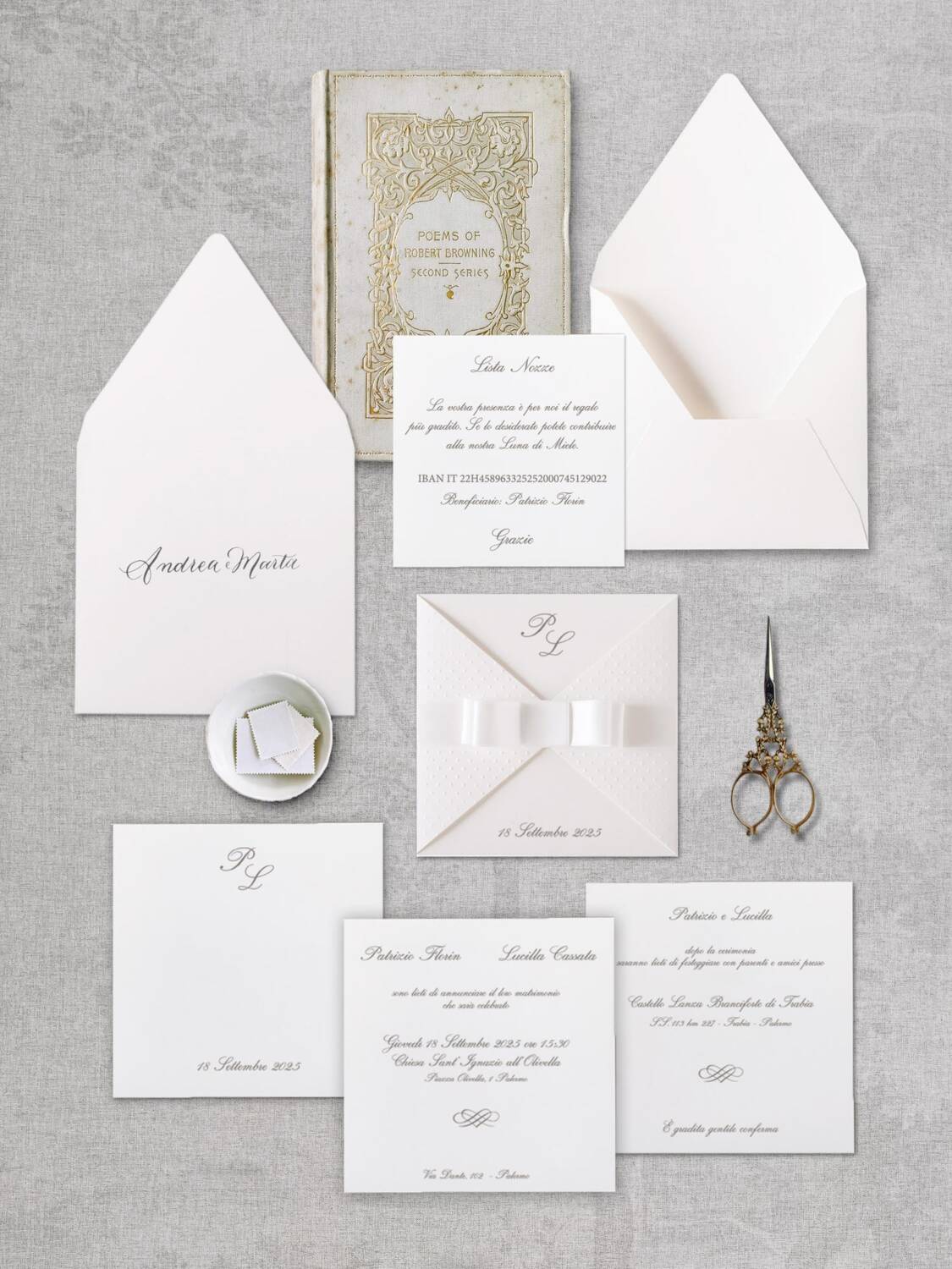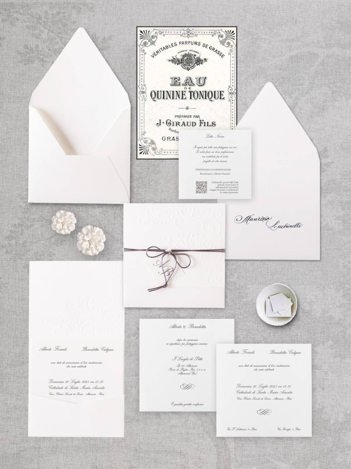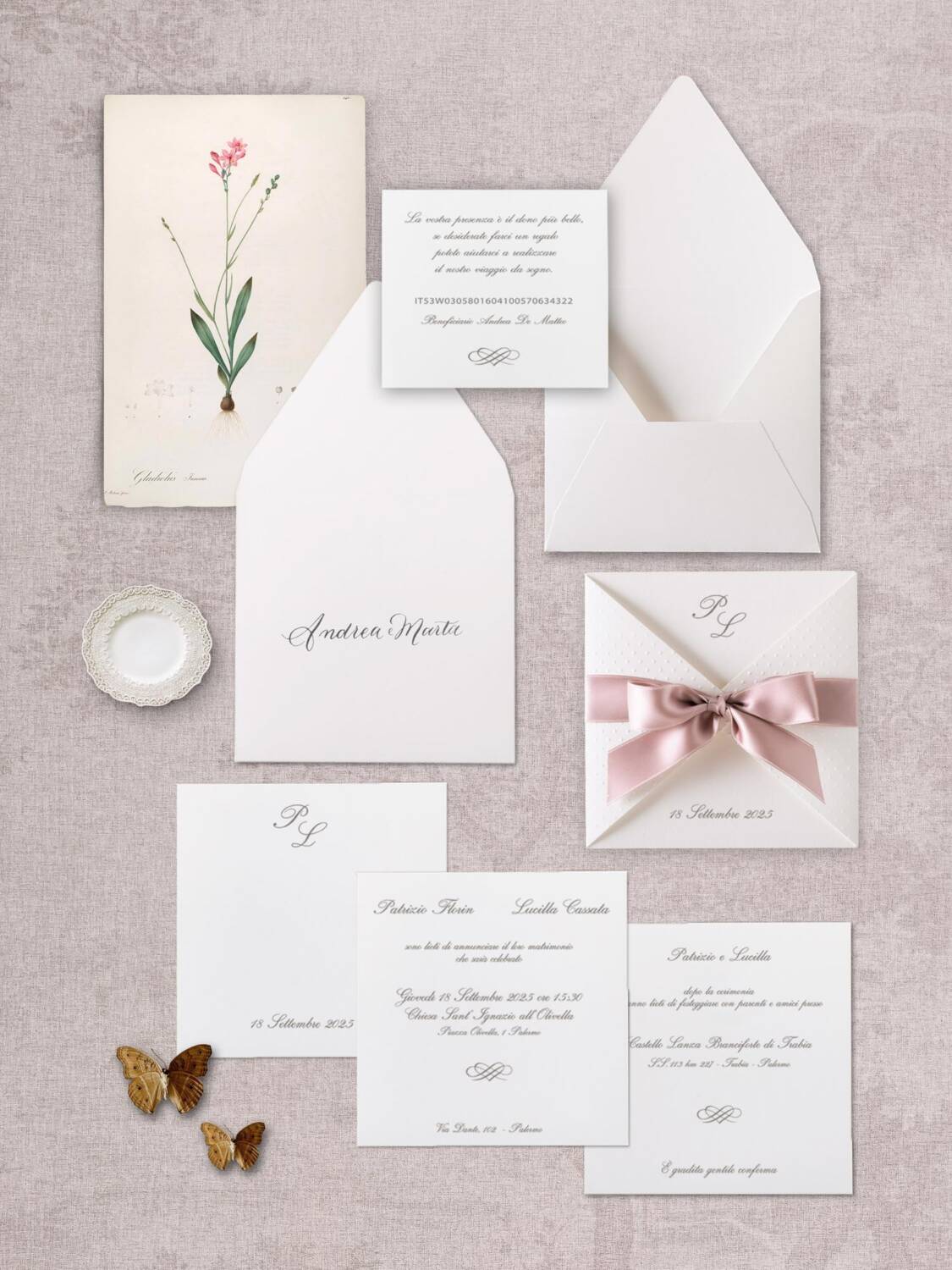 Che tu preferisca una combinazione “ton sur ton” o un deciso contrasto tra fiocco e carta, impreziosita dalla grafica e dagli altri motivi decorativi, la tua partecipazione elegante saprà comunicare ai tuoi invitati un gusto e uno stile assolutamente unici.