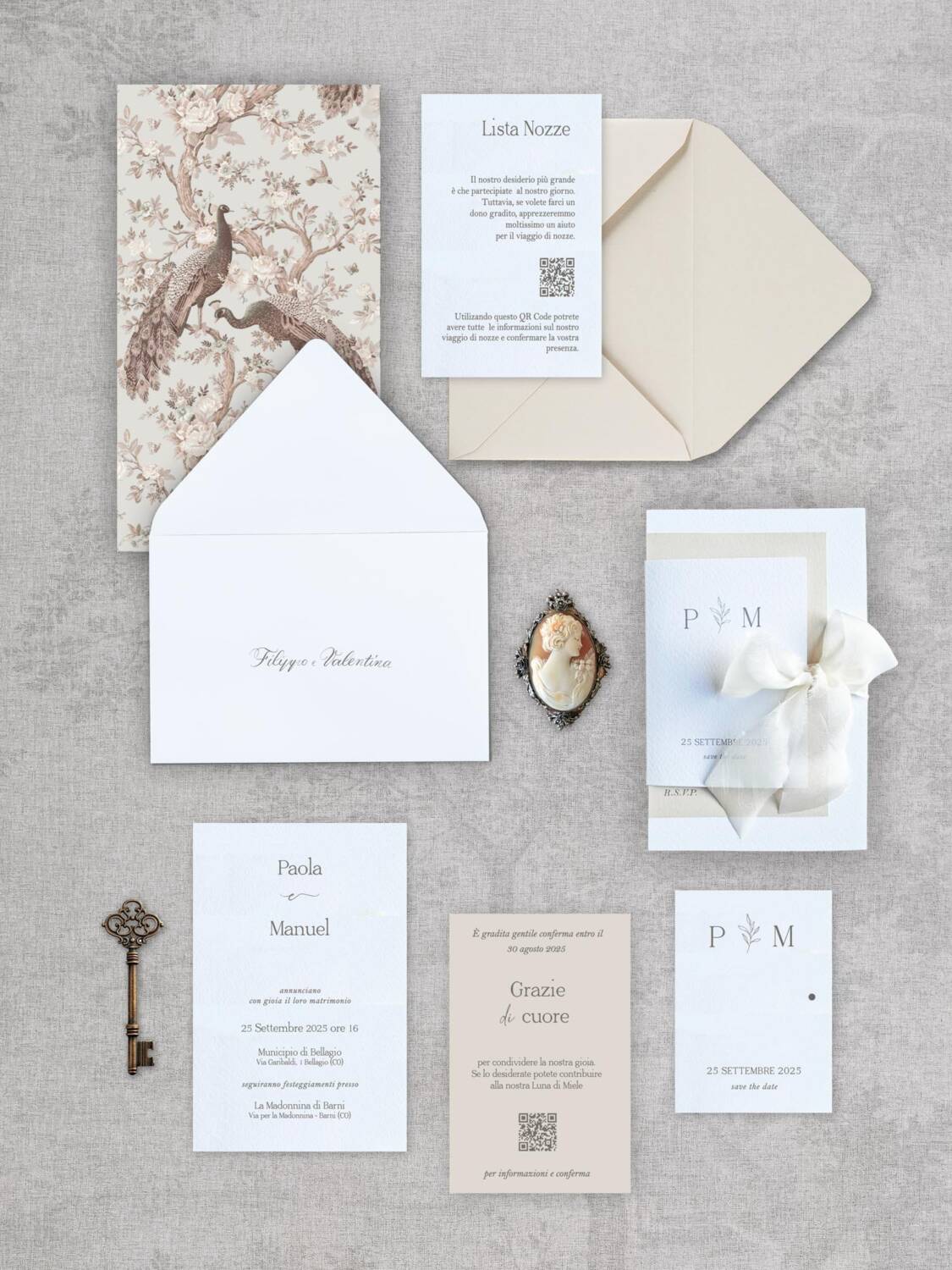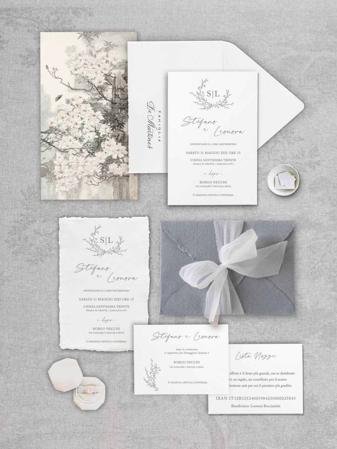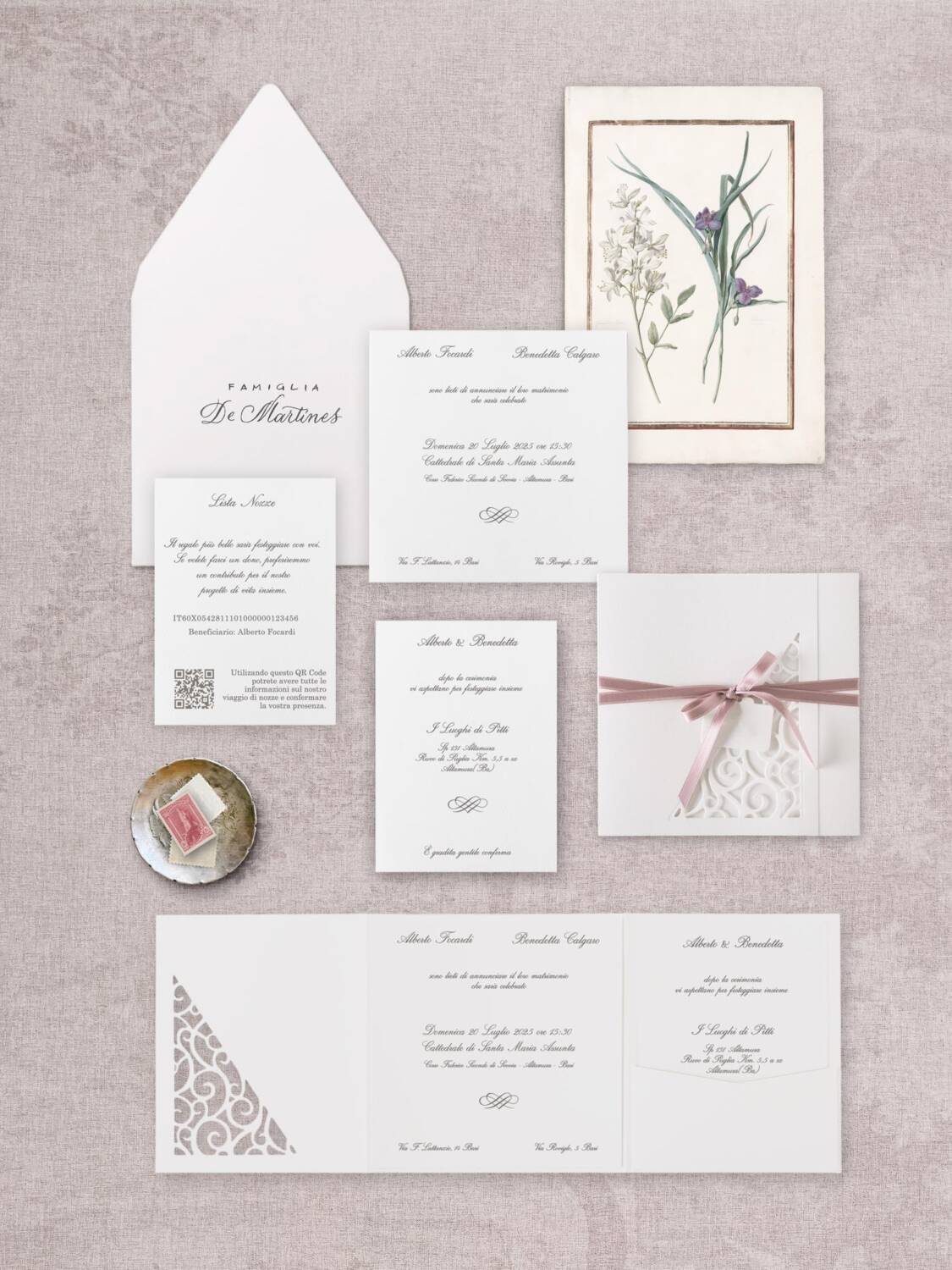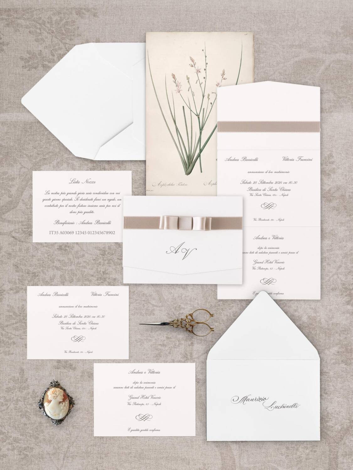 Che tu preferisca una combinazione “ton sur ton” o un deciso contrasto tra fiocco e carta, impreziosita dalla grafica e dagli altri motivi decorativi, la tua partecipazione elegante saprà comunicare ai tuoi invitati un gusto e uno stile assolutamente unici.
