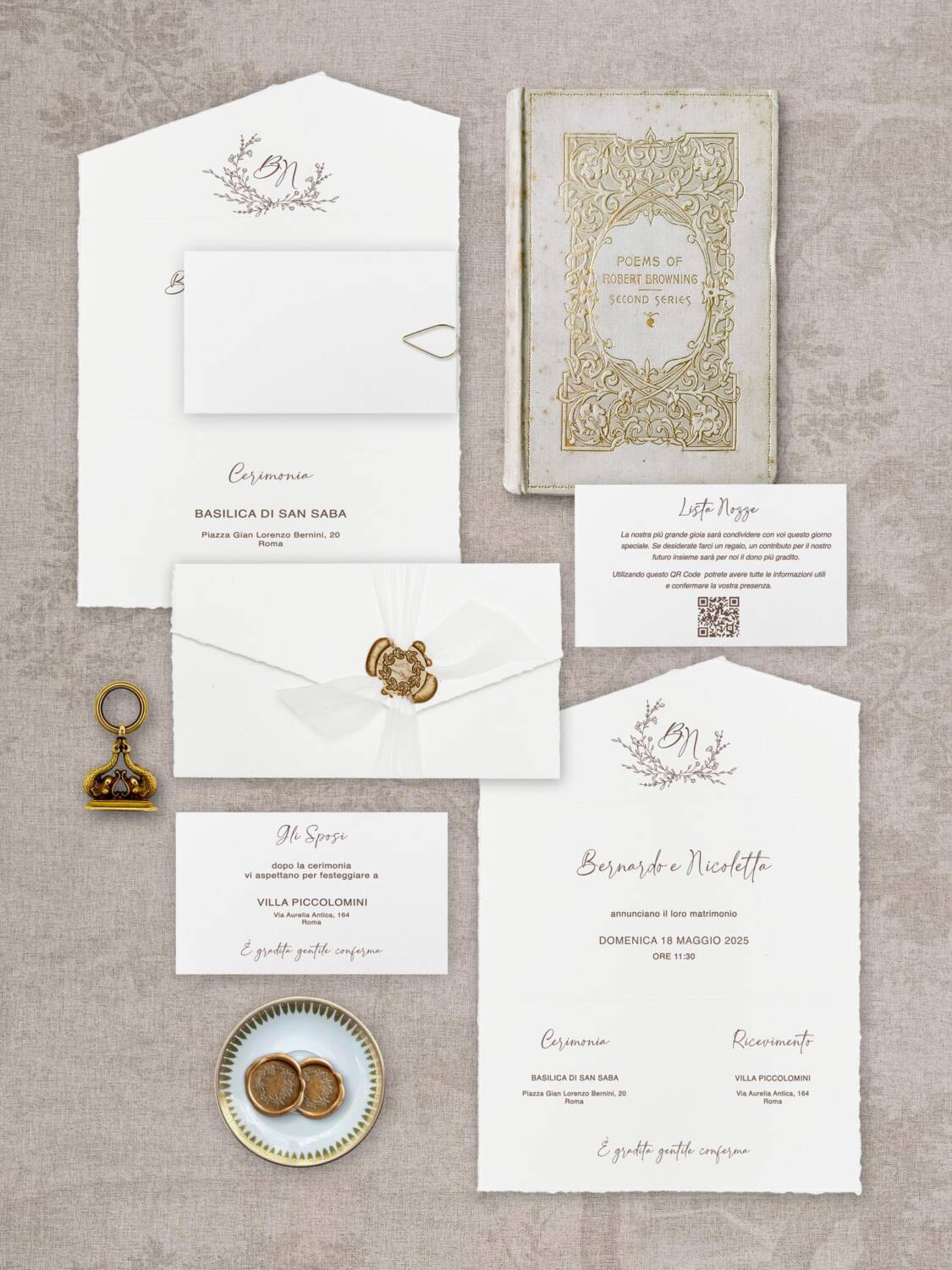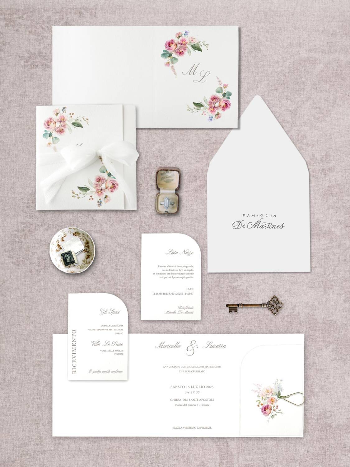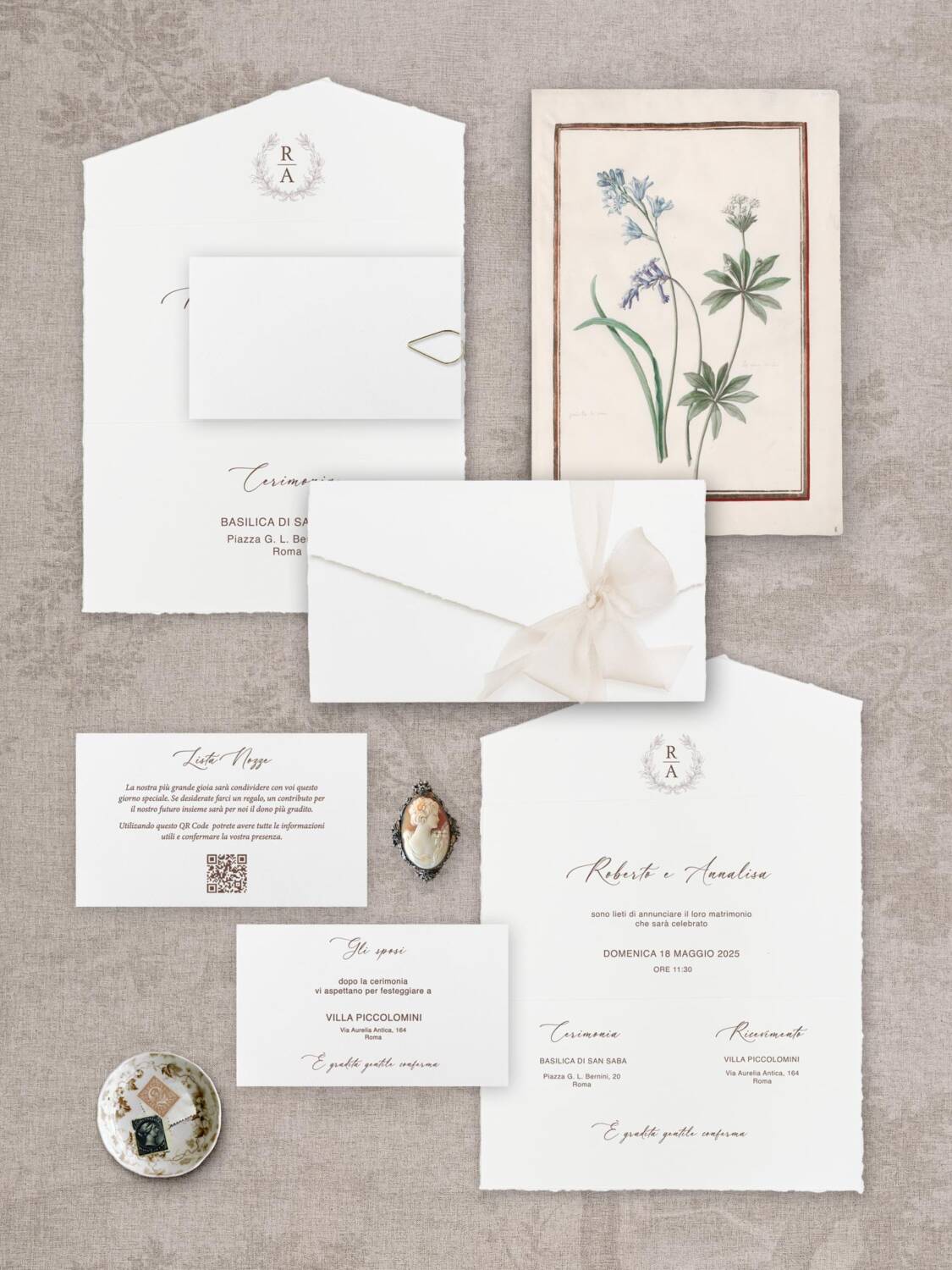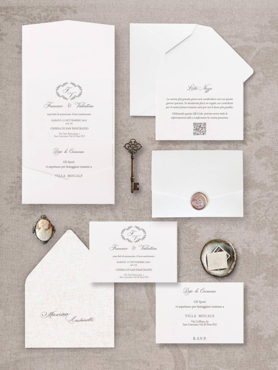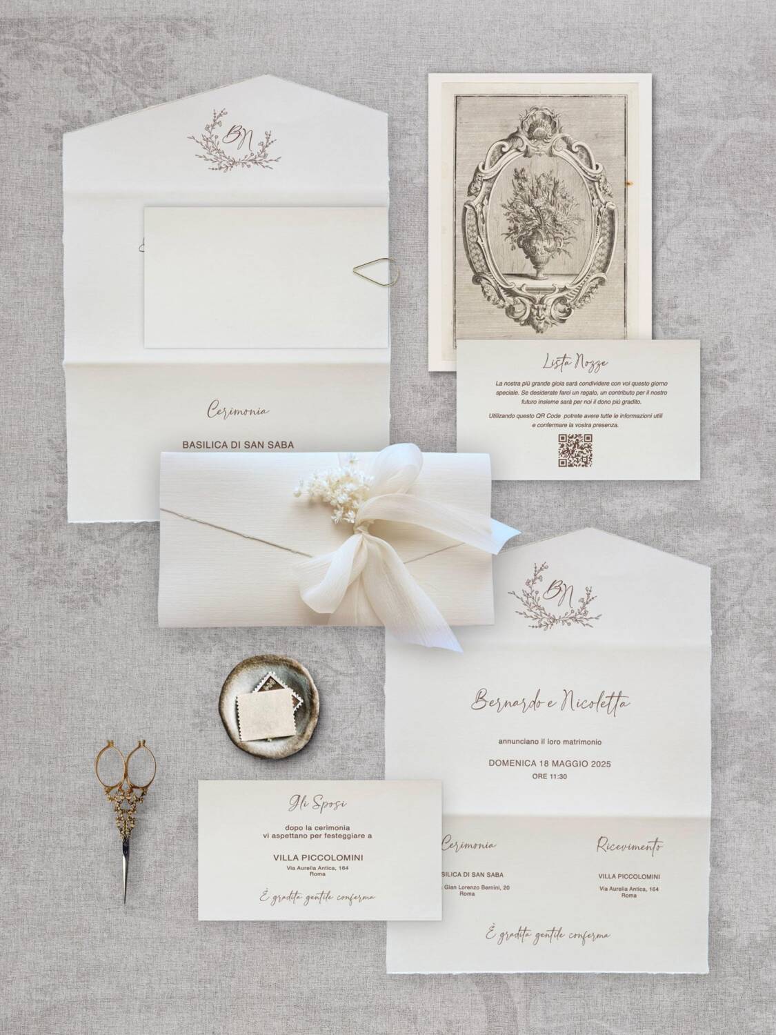 Che tu preferisca una combinazione “ton sur ton” o un deciso contrasto tra fiocco e carta, impreziosita dalla grafica e dagli altri motivi decorativi, la tua partecipazione elegante saprà comunicare ai tuoi invitati un gusto e uno stile assolutamente unici.