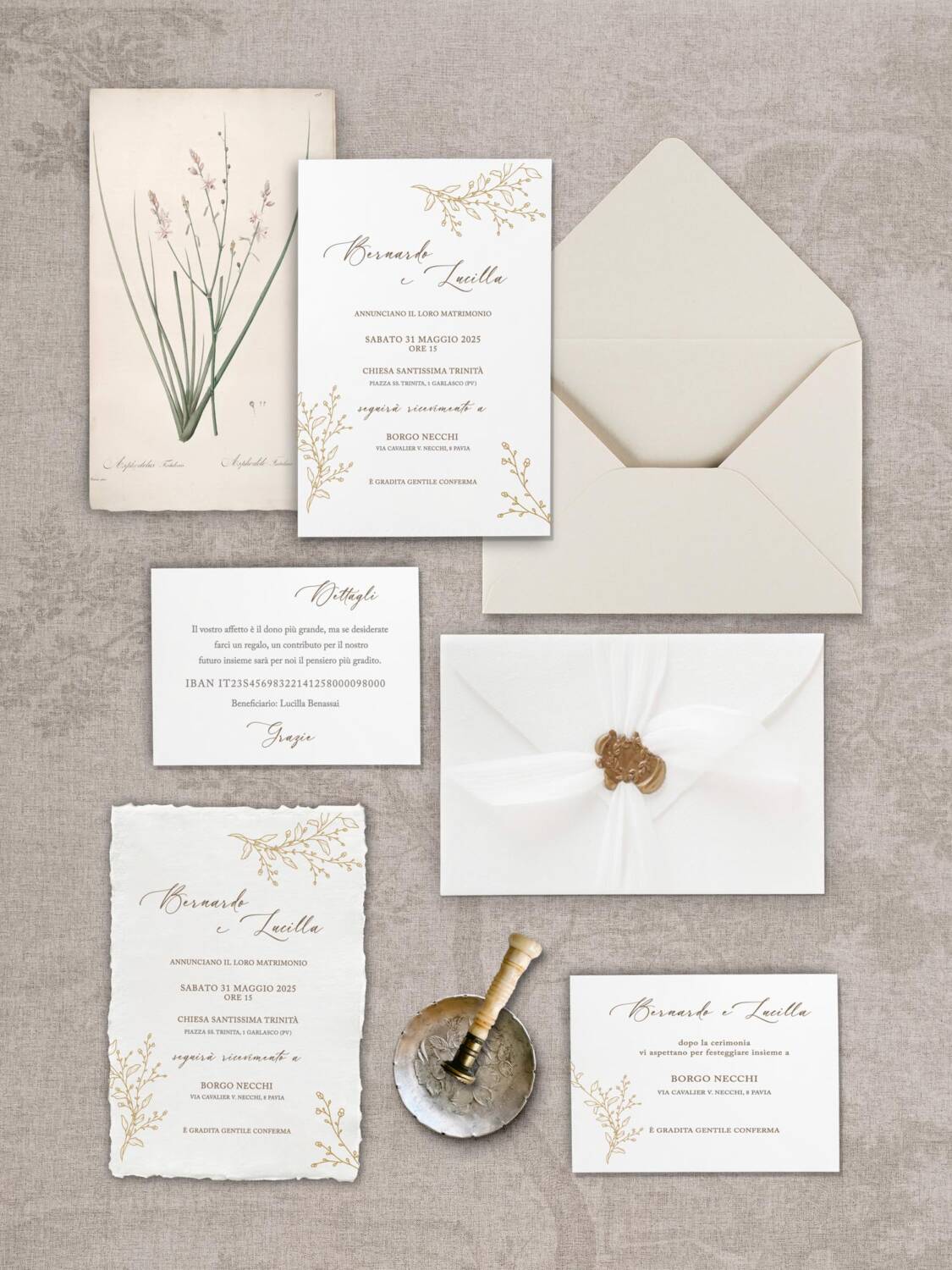 Dall’eleganza sobria della partecipazione “Melissa“al gusto più country della “Ariel“, dallo stile formale della partecipazione “Orchidea“alla realizzazione in più materiali della “Peonia“, nella nostra linea “Elegante” potrai trovare l’immagine per il tuo matrimonio che stai cercando.