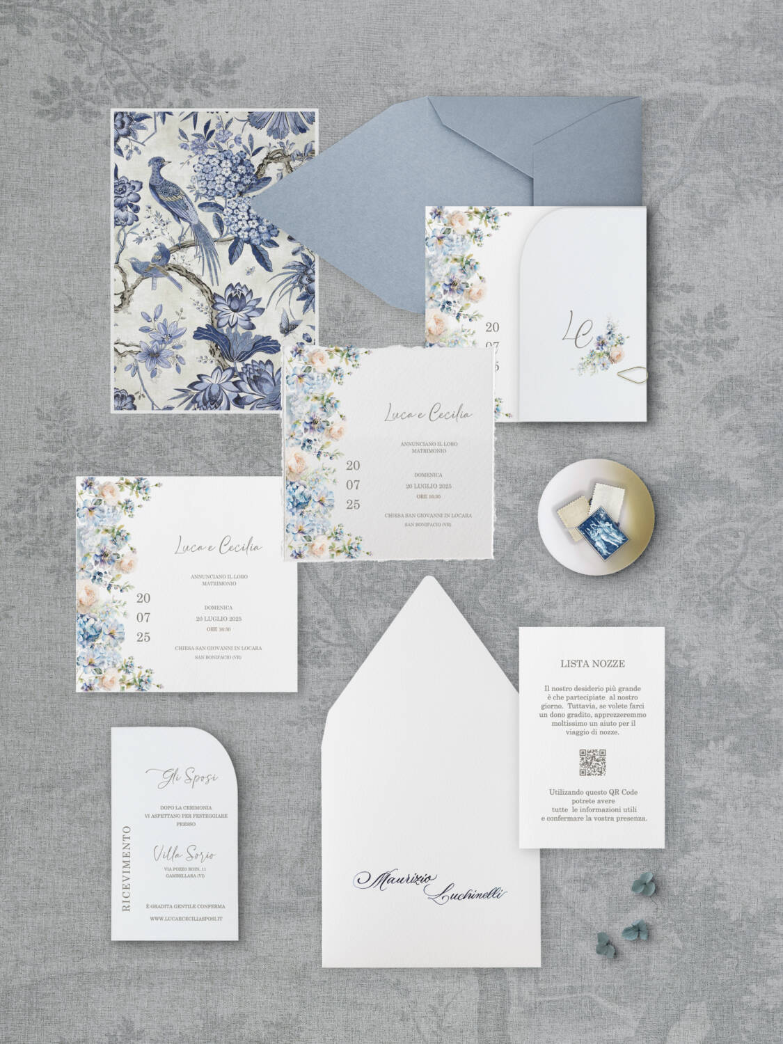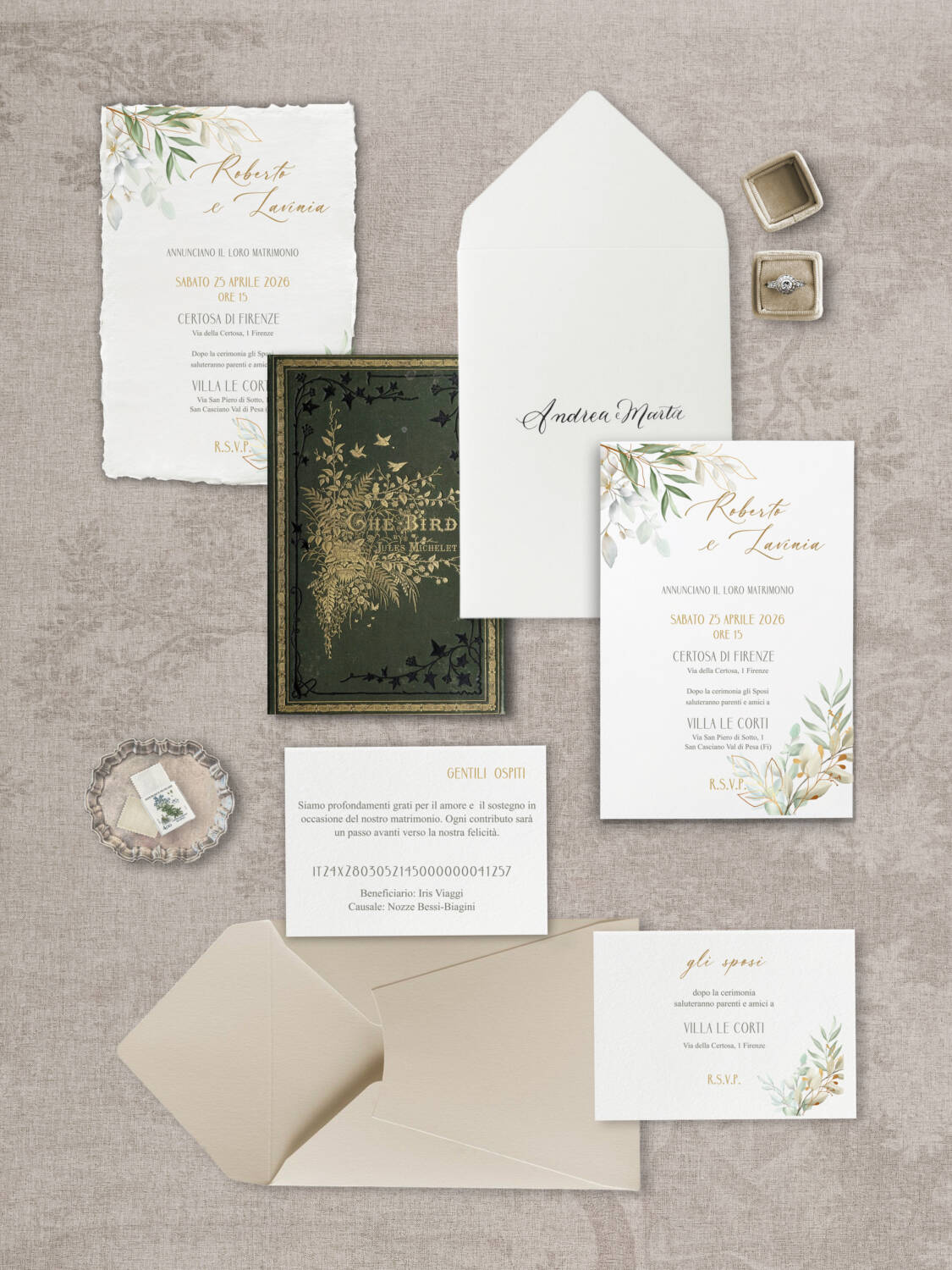 Le partecipazioni di matrimonio floreali sono presentate in due versioni: con un unico biglietto (che riporta i dati sia della partecipazione che dell’invito al pranzo) o con due biglietti (una partecipazione e un invito al pranzo). Le partecipazion di nozze floreali sono proposte con buste in vari colori, abbinati ai colori della partecipazione. Per renderla ancora più esclusiva, su richiesta è possibile aggiungere un sigillo bianco alla chiusura della busta.